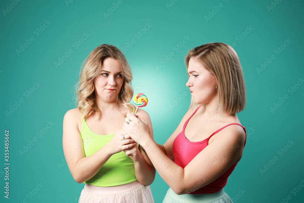 Two twins women holding colorful lollipops and having fun in studio isolated on green background .