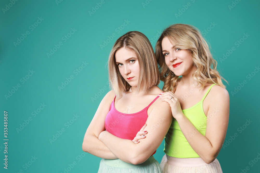 Portrait of young twin sisters in colorful tshirts showing emotions isolated on green background