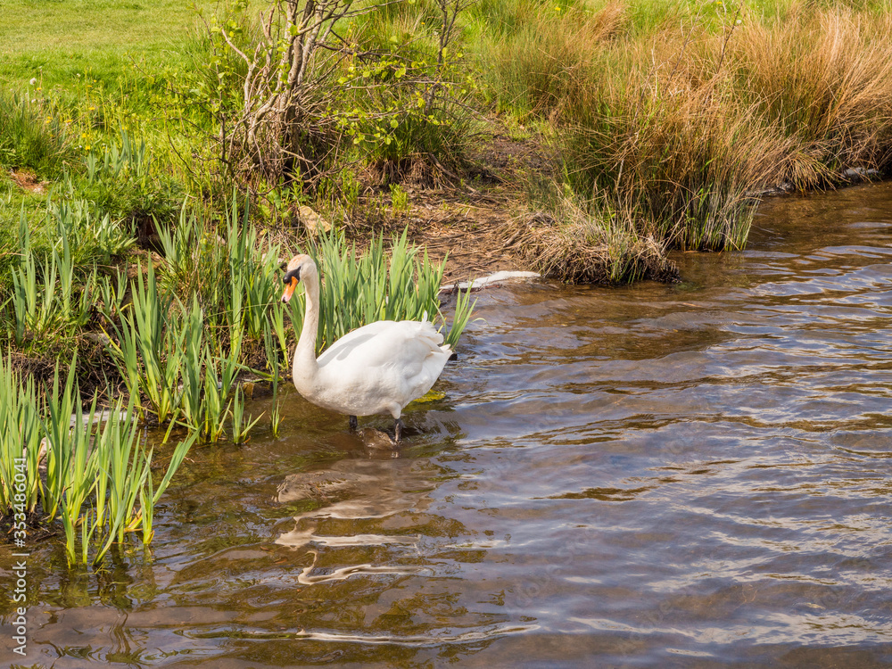 Male swan, Cob, looking for food in late springtime, Pickmere lake, Pickmere, Knutsford, Chestire