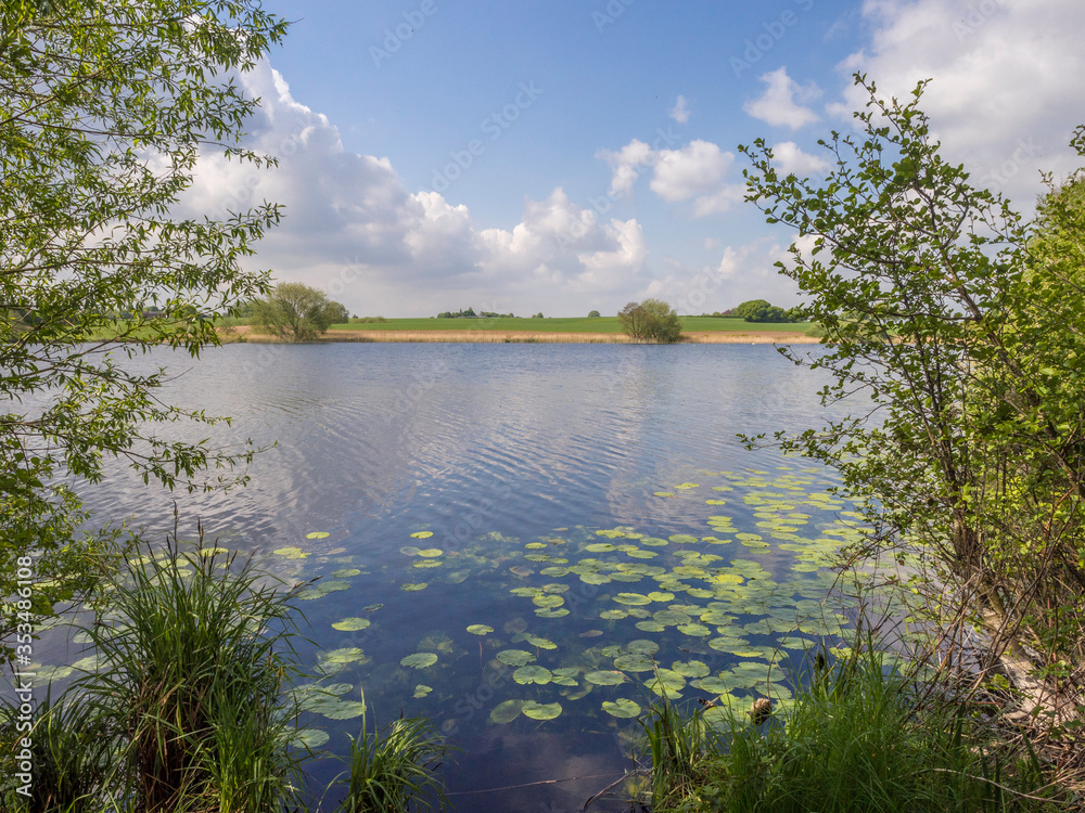 Water lilies on the lake in late spring, Pickmere Lake, Knutsford, Cheshire. UK