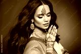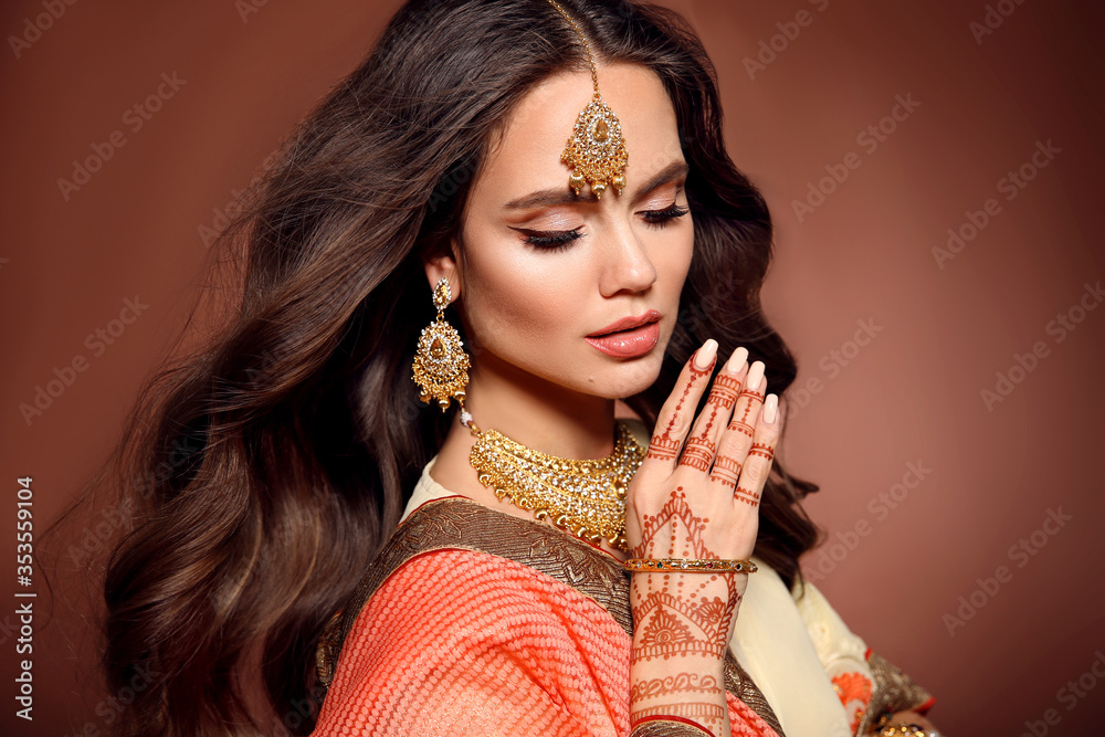 Mehendi. Portrait of beautiful indian girl in sari. Young hindu woman model with kundan golden jewelry set. Traditional Indian costume lehenga choli. Henna painting on woman's hands.