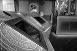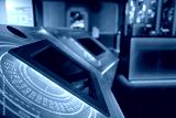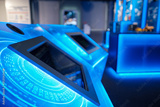 A close-up of the self-service machine monitor. Control center. Technological production, military and space station. Blue lighting.