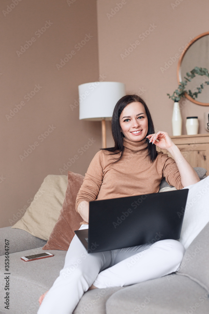 Happy brunette woman working on a laptop at home