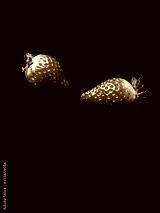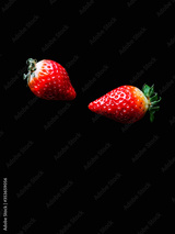 two ripe juicy red strawberries fly fall in the air on a dark background