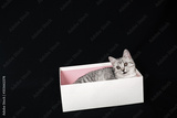 Scottish straight striped grey cat sits in a white box