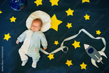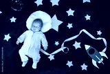 little boy baby sleeping in a suit of the astronaut on the background of the starry sky
