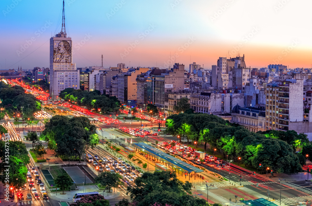 Aerial view of Buenos Aires, at Twilight, along 9 of July Avenue.