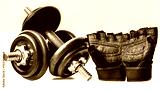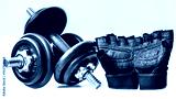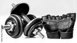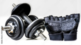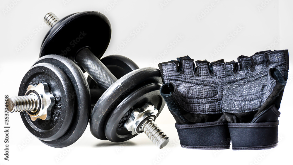 Pair of black dumbbells weights and gloves isolated on or over a white background. Fitness, bodybuilding and healthy lifestyle concept. Fitness exercise equipment dumbbells. Copy space for text.