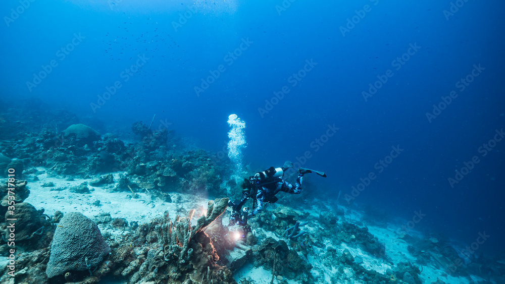 Seascape in turquoise water of coral reef in Caribbean Sea / Curacao with diver, fish, coral and sponge