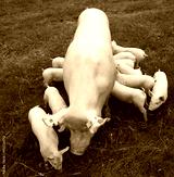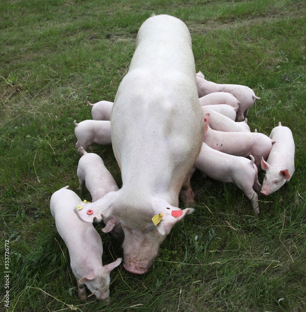Domestic pig suckling on fresh grass on meadow