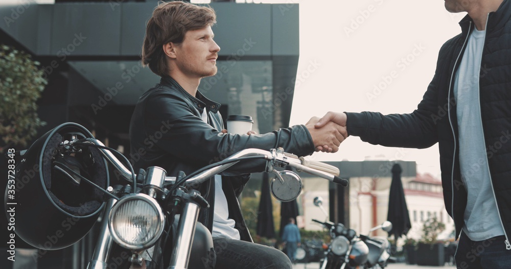 Two friends motorcyclists men meet on street