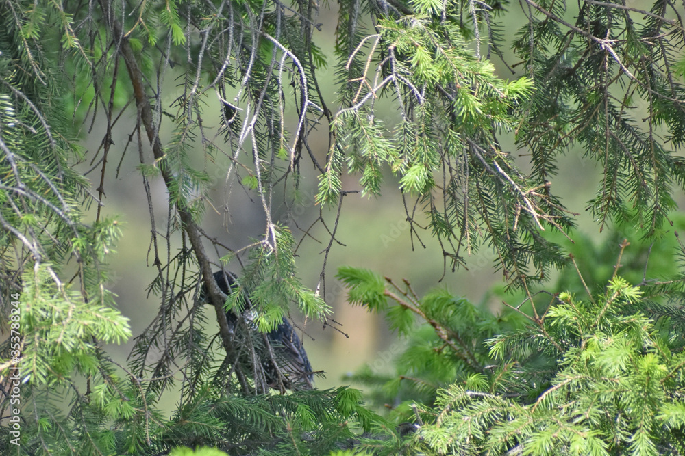 A Blackbird hid in the branches of a fir tree