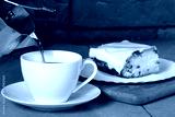 Pouring Coffee into Cup and Cheesecake. Breakfast.