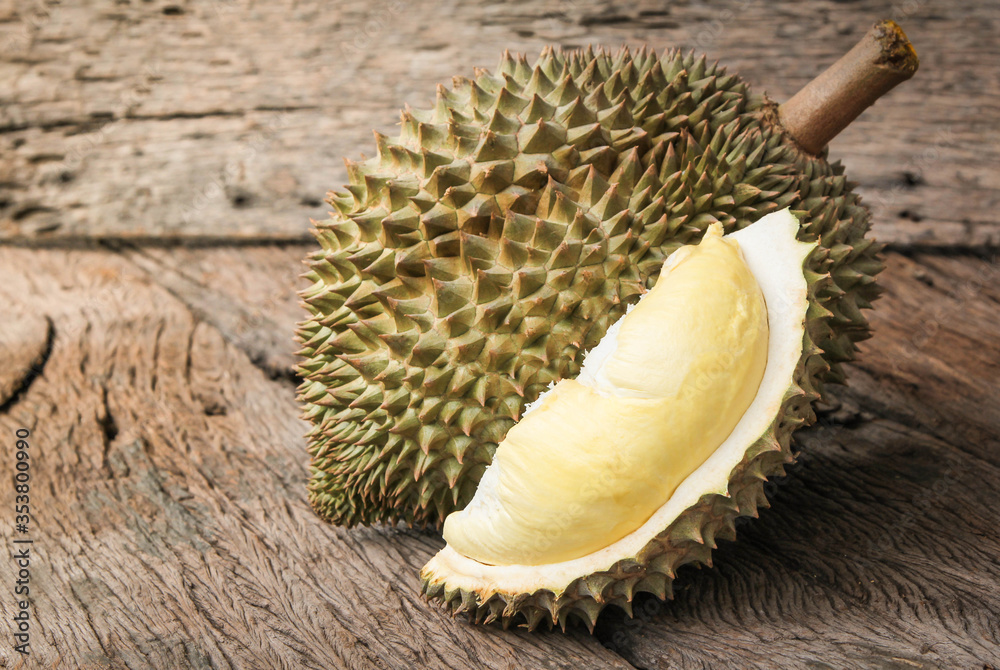 Durian riped and fresh, Durian peel with yellow color on old wood background. king of fruit from Thailand on summer season.