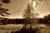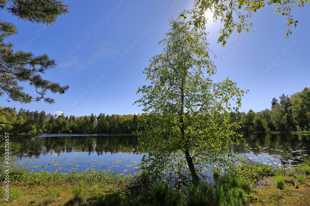 Spring forest in full bloom against the backdrop of the lake in Poland