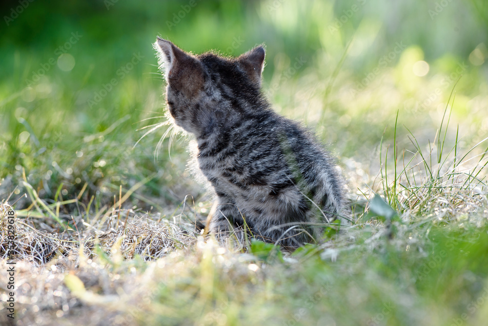 A small kitten is sitting on a green lawn in the grass with its back and looking back