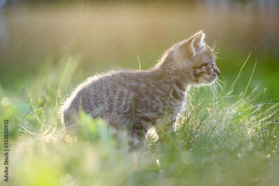 silhouette of a small kitten in the soft sunlight on the lawn. Soft focus .