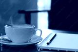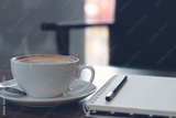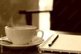 Cup of coffee and notebook and pencil on table in coffee shop with nobody