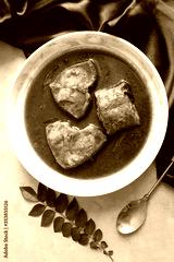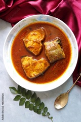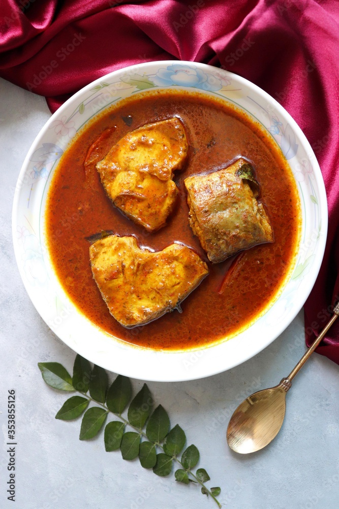 Indian Food - Homemade Spicy and tangy rohu or rui fish curry. Bangali famous red fish curry made with Labeo rohita. Copy space.