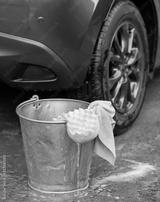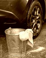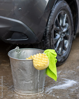 A bucket with detergent, microfiber cloth and sponge for car wash. Hand washing car with soapy water.