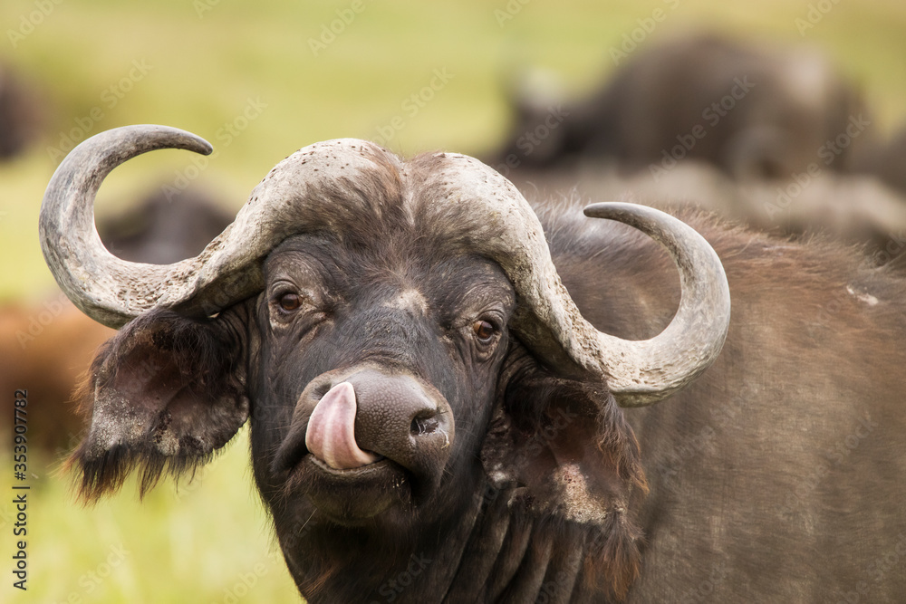 Buffalo in the grass during safari in Serengeti National Park in Tanzani. Wilde nature of Africa.