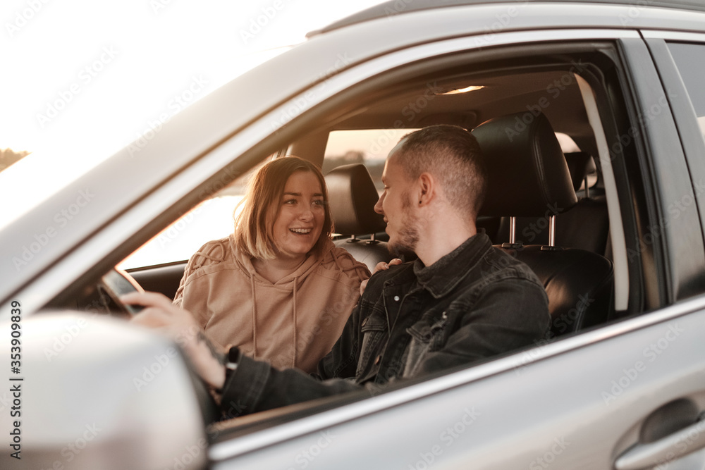 Young Couple Sits in a Car and Enjoys Ride, Weekend and Travel Concept