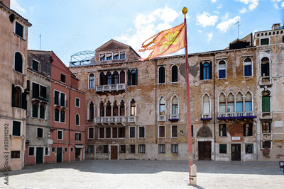 The Venetian flag in small square in Venice called Campo San Maurizio desert during the Covid19 pandemic lockdown in May 2020