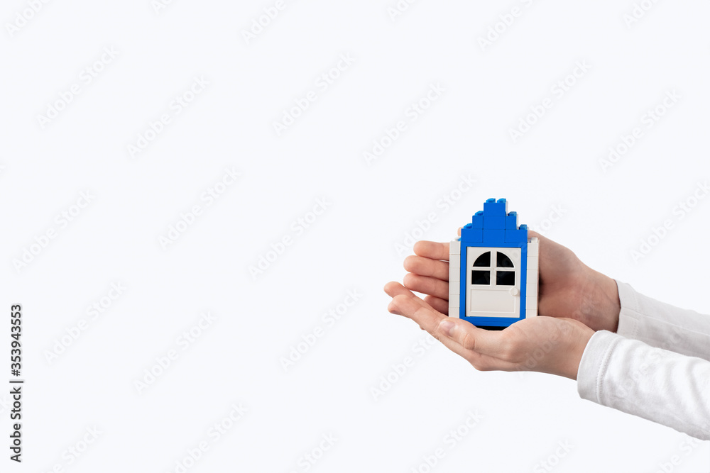 Hand holding house isolated in white background. The house in human hands, real estate agency concept, mortgage