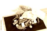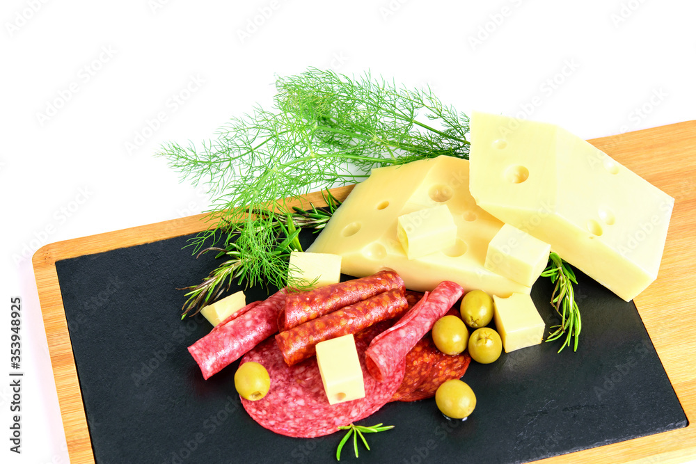 Slices of sausages salami, chorizo, cheese, green olives and fresh dill on the tapas board closeup, white background. Fresh healthy mediterranean fast snack.