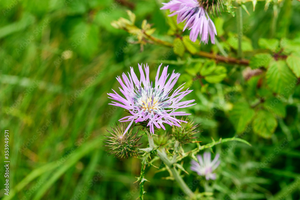 Wild prickly thistle on the natural green background closeup. Thistle symbol of Scotland.