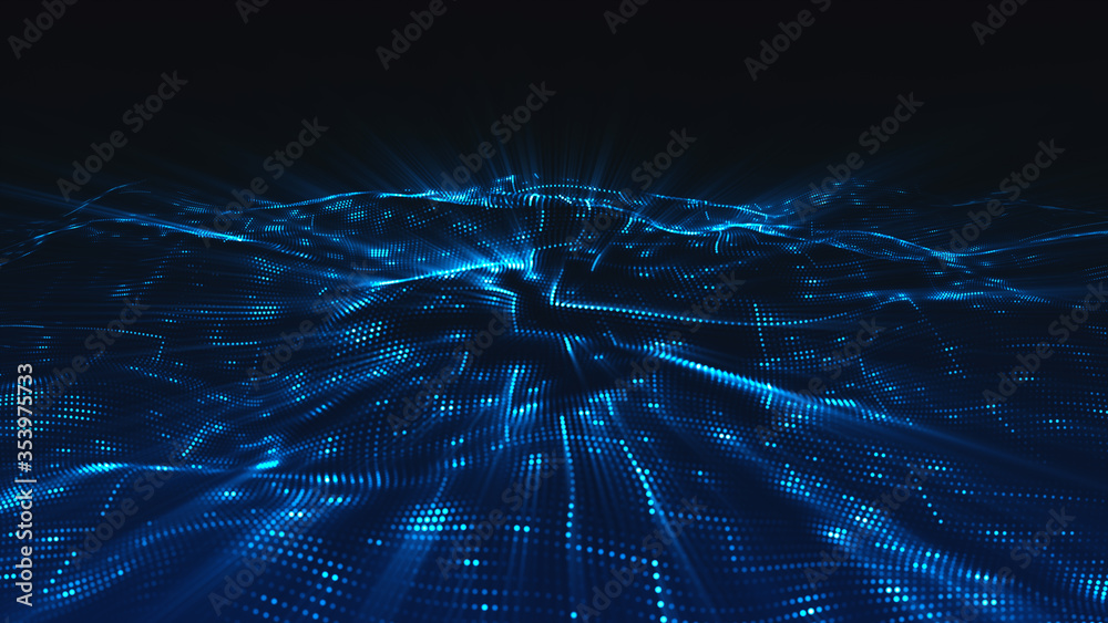 Blue digital particles wave flow and light, Digital cyberspace abstract background