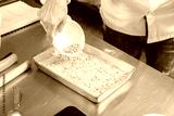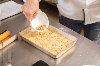 A pile of pine nuts on the dough in a baking dish.