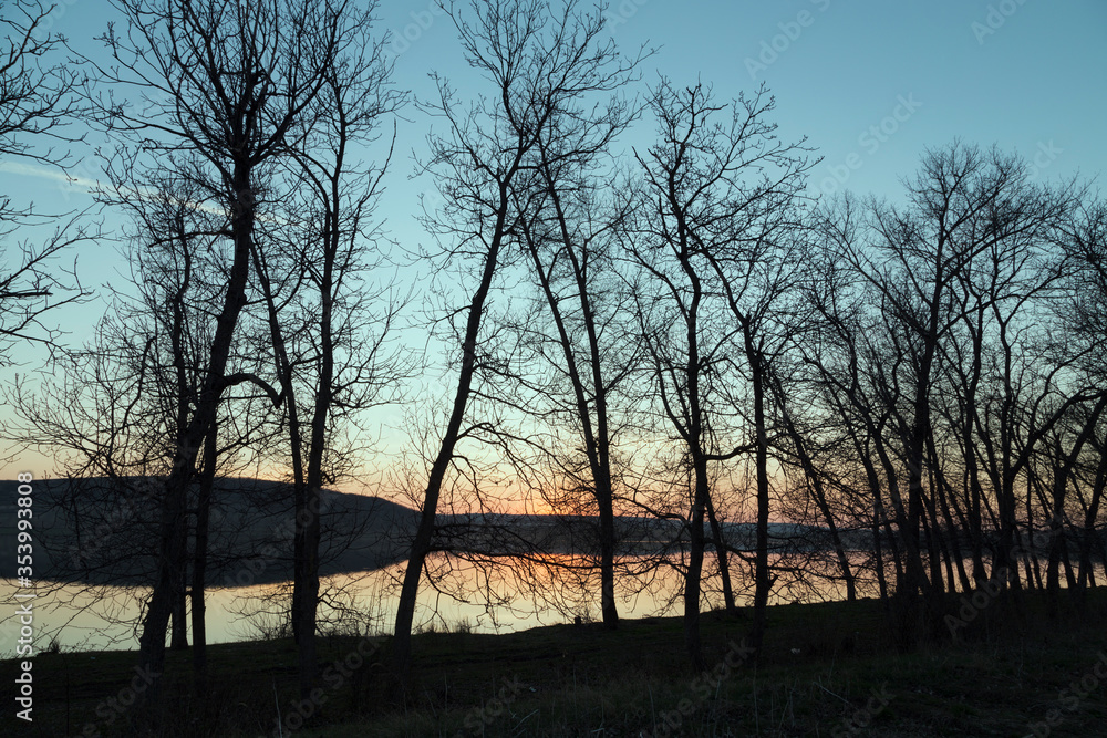 Colorful sunset on the lake in early spring.