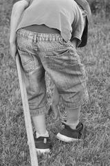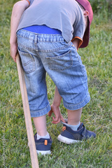 The boy straightens the toe, not letting go of the prune