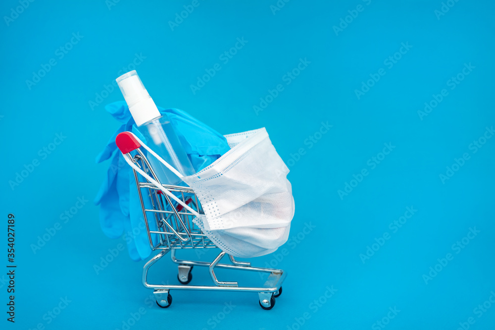 Coronavirus prevention medical surgical mask, blue gloves and hand sanitizer gel for hand. Supply of virus protection to the hospital.