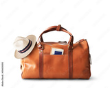 Vacation concept, large classic brown leather travel bag with hat