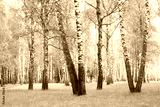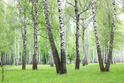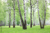 Beautiful birch trees with white birch bark in birch grove with green birch leaves in summer
