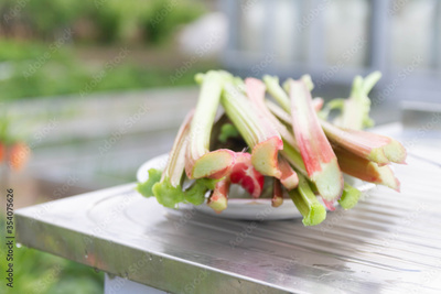 The stalks of rhubarb on a plate for the pie.