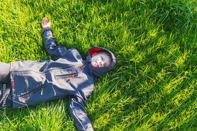 A teenage boy lies in a jacket in summer or spring on the green grass. Sunny day.