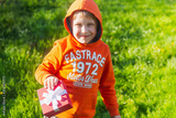 A boy in an orange sweatshirt sits on the green grass and holds a gift box in his hand. The child is smiling and happy.