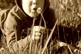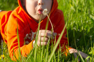 A boy in an orange sweatshirt lies on the green grass and blows on a dandelion. A beautiful, sweet child.