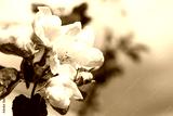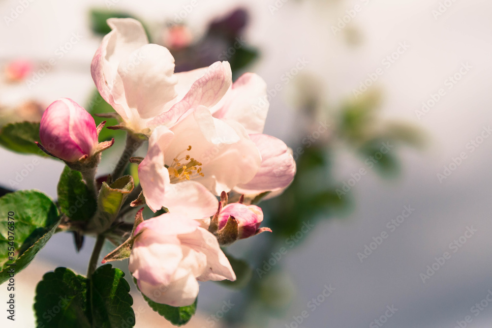 Background of airy pink and white petals, buds and flowers of Apple trees.
