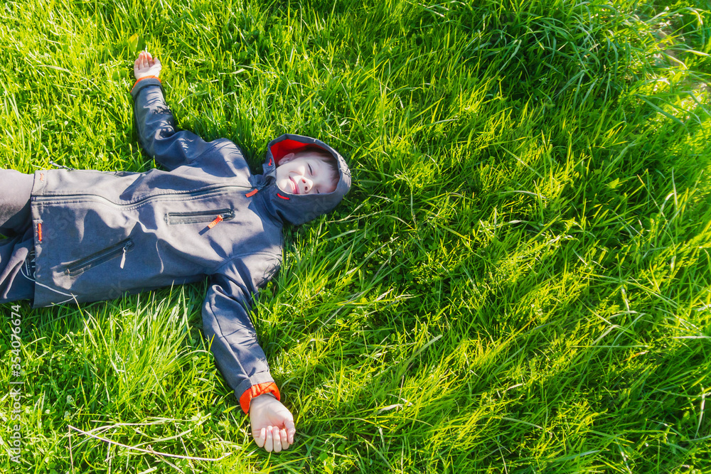 A teenage boy lies in a jacket in summer or spring on the green grass. Sunny day. The teenager is resting and relaxed.