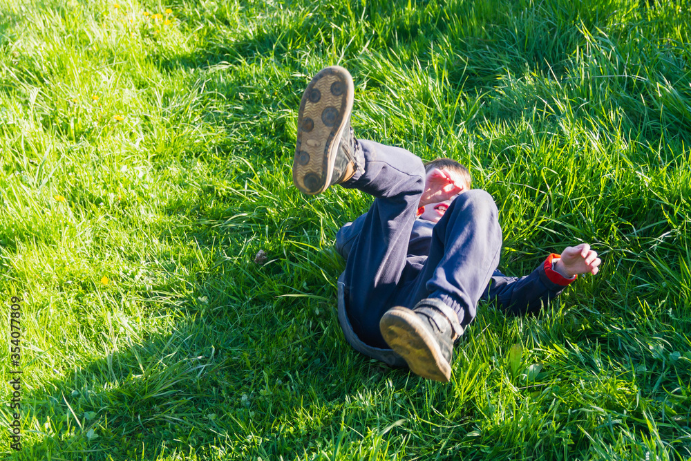 A teenage boy has fallen on the grass in a meadow and is happy. Cheerful boy in spring or summer.
