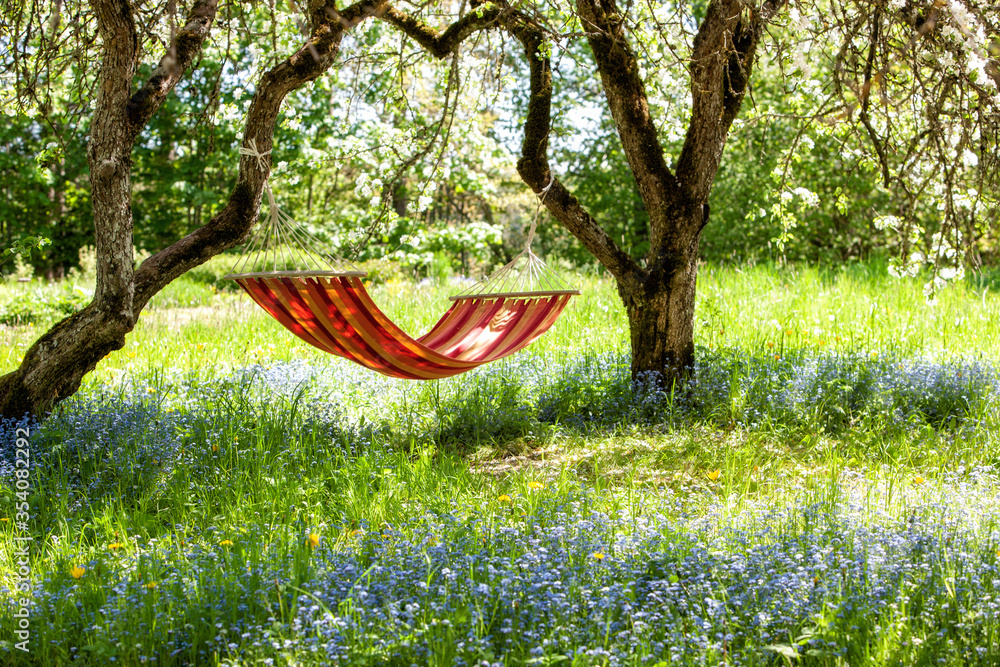 Beautiful landscape with red hammock in the spring garden with blooming apple trees, sunny day. Concept for relaxation, rural tourism. Selective focus