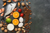 Food allergens. Seafood, milk, chocolate, nuts, citrus fruits, eggs. Allergic food concept. Top view, flat lay, copy space.