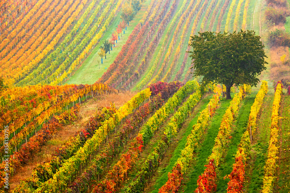 Colorful rows of vineyards in autumn. Green lonely tree in fog among vineyards. Autumn scenic landscape of South Moravia in Czech Republic.