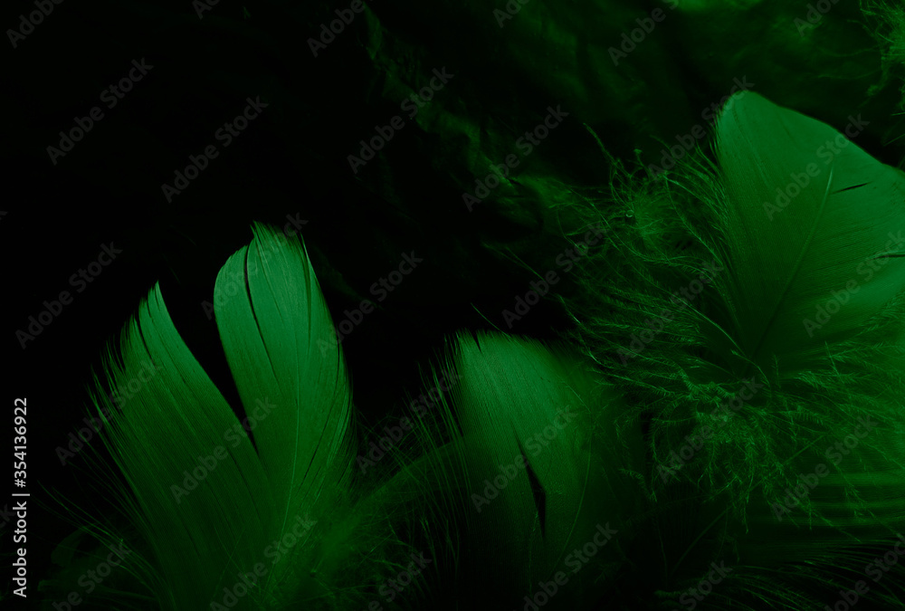 Beautiful abstract white and green feathers on black background and soft white feather texture on white pattern and green background, feather background, green banners