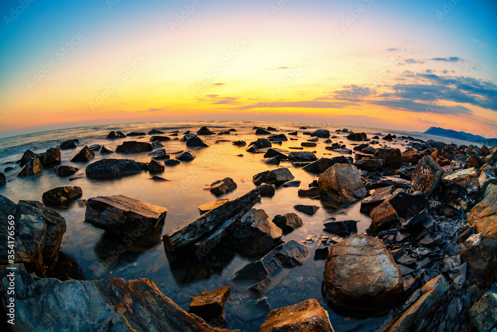 Beautiful seascape. Sunset and the sea natural landscape with stones. Fisheye lens