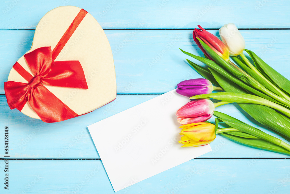 Colorful spring tulip flowers with decorative giftbox and blank photo on light blue wooden background as greeting card. Mothersday or spring concept.